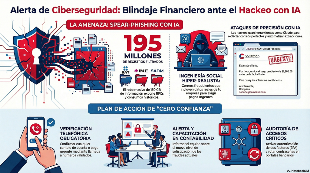 - Auditoría de Accesos Críticos: Obliga a la rotación de contraseñas en los portales bancarios y del SAT, y asegura que la autenticación de dos factores (2FA) esté activa en todos los correos corporativos.